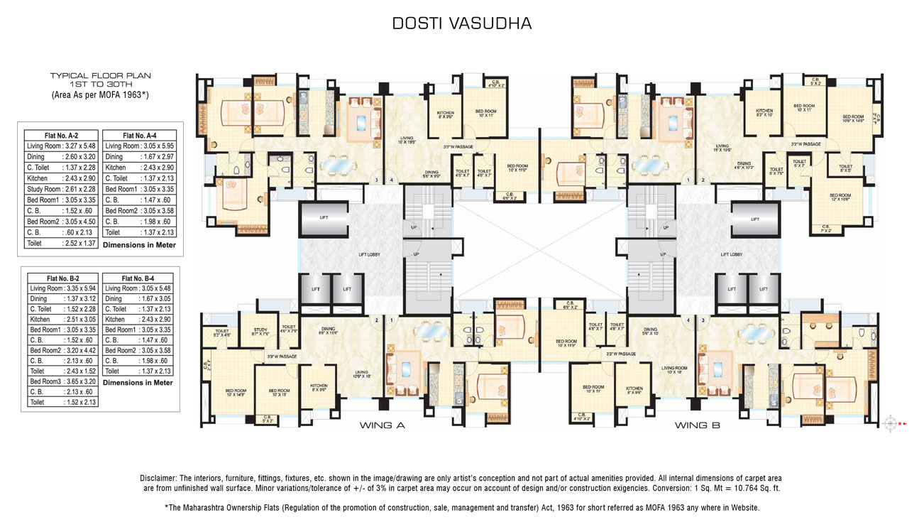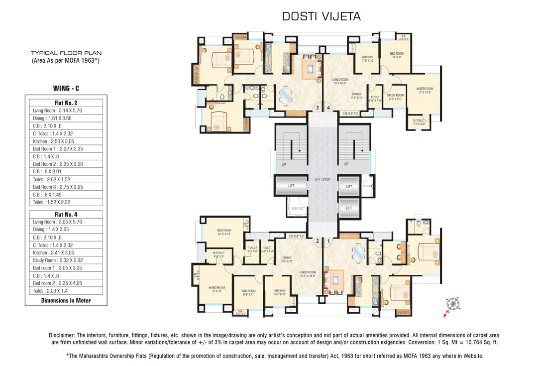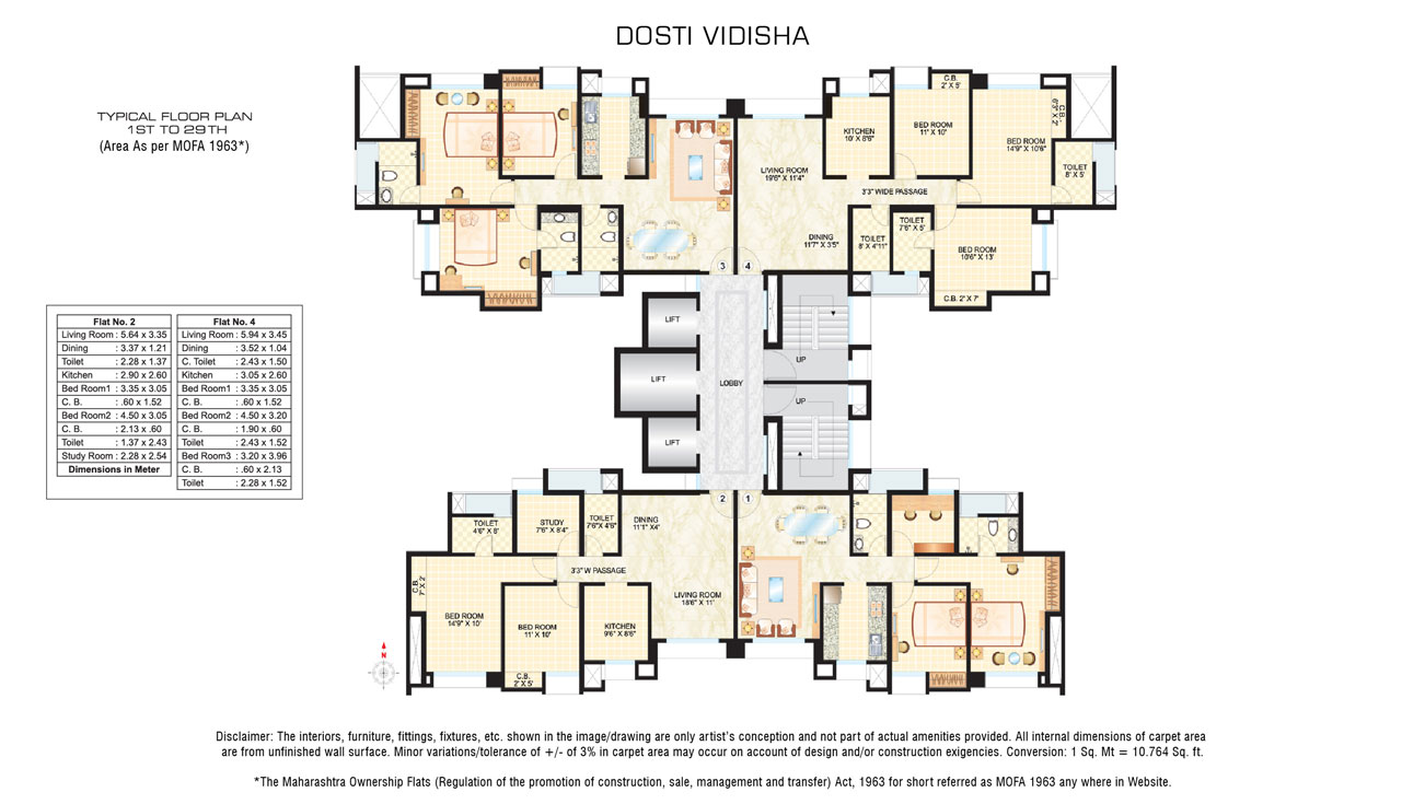 The interiors, furniture, fittings, fixtures, etc. shown in the image/drawing are only artist's conception and not part of actual amenities provided. All internal dimensions of carpet area are from unfinished wall surface. Minor variations/tolerance of +/- of 3% in carpet area may occur on account of design and/or construction exigencies. Conversion: 1 Sq. Mt = 10.764 Sq. ft